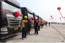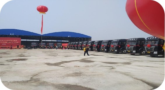 在交车仪式现场,50台崭新的豪瀚牵引半挂自卸车整装待发