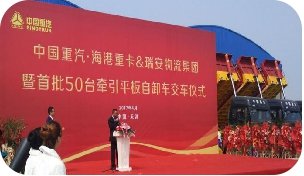 2017年4月6日,天津滨海新区锣鼓喧天、彩带飘飞,处处洋溢着蓬勃的朝气。中国重汽天津海港重卡汽车销售服务有限公司与瑞安集团,在这里隆重举行了50台豪瀚6×4牵引车交车仪式。