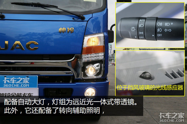 帅铃全能卡车配备了自动大灯以及远近光一体式透镜大灯。自动大灯打开后,阳光传感器根据感应到的光线控制大灯的开启/关闭,过隧道时不用人工控制大灯开启,增加行驶安全性以及便利性。