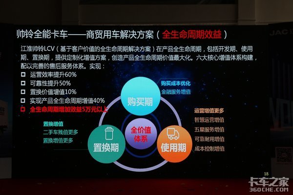 这也是江淮帅铃提出的“基于客户价值的全生命周期解决方案(LCV)”,是对物流企业运营车辆数据的大量专项研究,并结合中国物流行业的现状,推出的客户价值的全产品周期解决方案。LCV通过产品定制、运营增值、价值服务实现轻卡车辆运营更高价值回报的综合解决方案,实现全产品生命过程价值最大化。