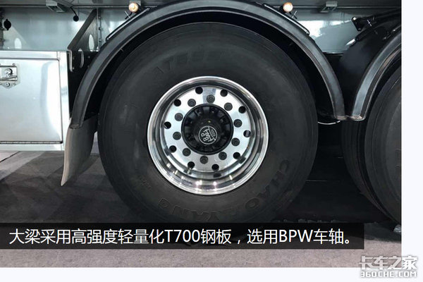 大梁采用高强度轻量化T700钢板,保证强度的同时还能够降低车辆自重。采用BPW车轴,铝合金轮圈,整车自重为8.8吨。以6x4牵引车为例,主车加上挂车还能拉30吨左右的货物。对当前流行的9米6前四后八冷链车可能会产生不小的冲击。