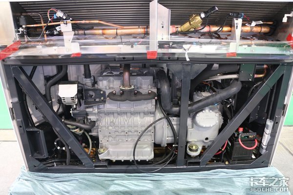 在现场还有一款油电两用的制冷机组,这款750机组配备了一台3缸的柴油发动机和一台电动机,在行驶过程中可以直接使用柴油发动机带动压缩机进行工作。在停车休息的时候可以用外接电源,然后使用电动机带动压缩机。