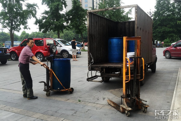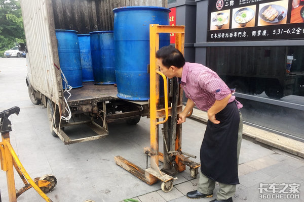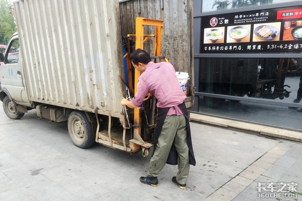 这是近日在一家酒楼门前发现的,一台半封闭式的小微卡正在装卸泔水,车主兼职起了装卸这些桶装泔水的工作,而他的身边正放了两台液压小叉车,这就是他装卸时的好帮手。