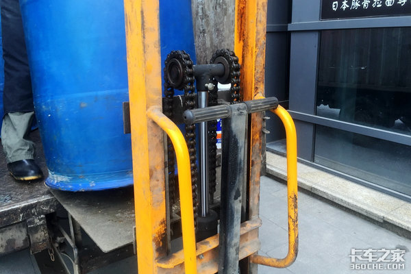 这两台小工具车有不同的功能,因为筒子是圆形的体积也较大,靠人类搬运显然很困难,所以定制了这种三角轮的工具,用于将桶装泔水从酒店的后厨运输到车旁,液压主要用于抓紧桶子,同时也可以调节高度,,而另一个就我们比较常见的手摇液压叉车,主要用于将这一百多斤桶子装上车的工具。