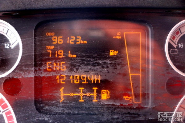 因为T7H的仪表盘总里程数只要过了百万,就会自动归零重新计算,所以这台车上的里程数只显示96123km,已经逼近110万公里,驾驶员刘师傅说挂车正在装车,最迟后天又要奔赴新疆,这一趟途中就会正式突破110万公里。