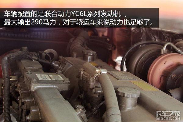 联合卡车中置轴轿运车采用的是联合动力YC6L系列发动机 ,最大输出290马力,与之匹配的是法士特9档变速箱,这样的动力配置足以满足用户的日常运输需求。同时发动机排放满足国家最新的国五标准,对于用户来说不用担心排放的问题