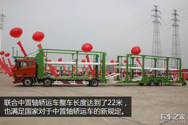 中置轴轿运车这个话题从去年921治超开始就一直十分热门,各车企都在推出相关车型。但是到目前为止,路上能看到的中置轴轿运车依旧稀少。依照交通部在2016年8月18日发布了《车辆运输车治理工作方案》,现有超长轿运车在2017年6月30号前需要替换20%,变为符合新GB1589规定的新车。距离超标轿运车第一阶段的治理也越来越临近,各大车企也开始推广自家的中置轴轿运车产品,接下我们要看到的就是联合卡车的中置轴轿运车。