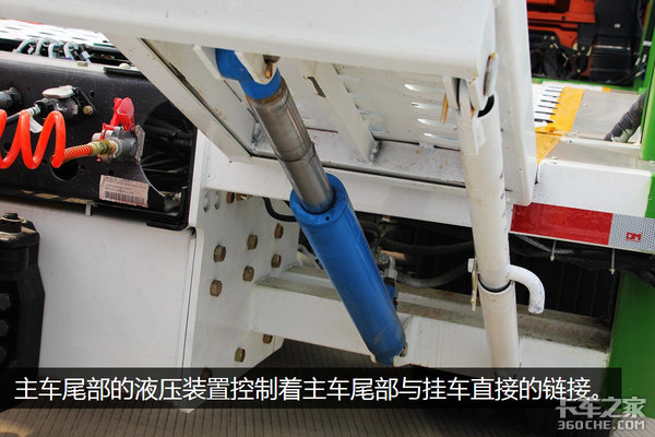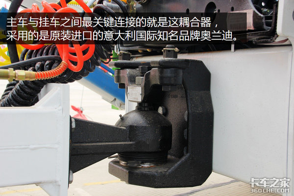 主车与挂车之间最关键连接的耦合器,采用的是原装进口的意大利国际知名品牌奥兰迪的产品,它跟国内目前很多中置轴产品用的喇叭口耦合器有些区别,它的内部使用的是一个90mm的球头,耐用度更好而且后期几乎不需要任何维护。