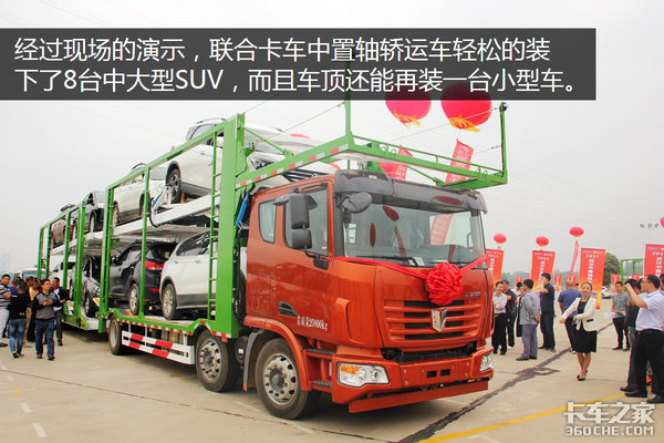 在现场的模拟装载中,联合卡车中置轴轿运车轻松的装下了8台中大型SUV,而且车顶还能再装一台小型车,如此看来装下10台中小型车辆应该非常轻松。