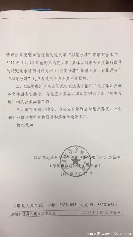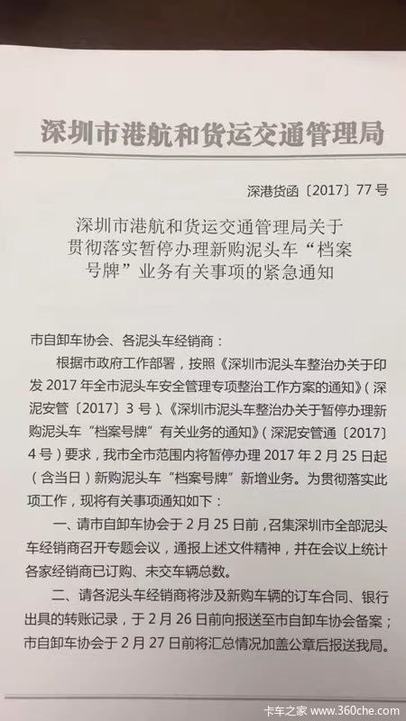 为加快推进新型全封闭式智能泥头车的推广工作,深圳在2017年2月25日起,将暂停办理新购泥头车“档案号牌”业务。2月25日之前已经购买的泥头车不受限制,购车日期以购车合同及银行出具的转账记录证明材料为准。待《深圳市新型全密闭式智能泥头车推广工作方案》落实后,在根据方案要求从新开启新购泥头车“档案号牌”业务。