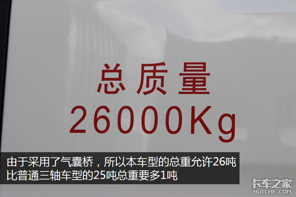 GB1589-2016规定的三轴车型最大总重是25吨,但对于采用气囊桥的三轴车型则可以多拉1吨,其允许的最大总重为26吨。减去这款车的自重11吨,这辆车可以合法装货15吨,对于快递车来说够用了。