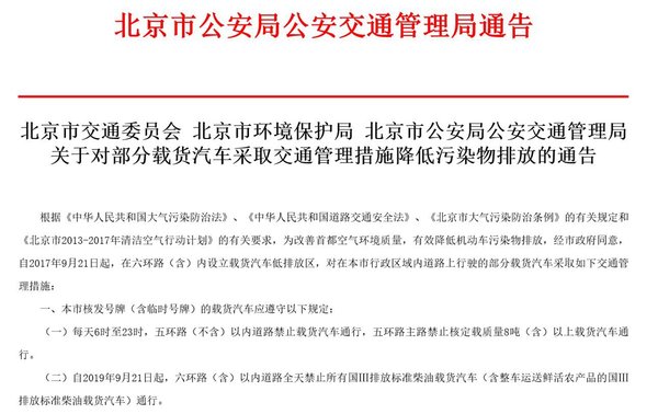 自2019年9月21日起,六环路(含)以内道路全天禁止所有国Ⅲ排放标准柴油载货汽车(含整车运送鲜活农产品的国Ⅲ排放标准柴油载货汽车)通行。